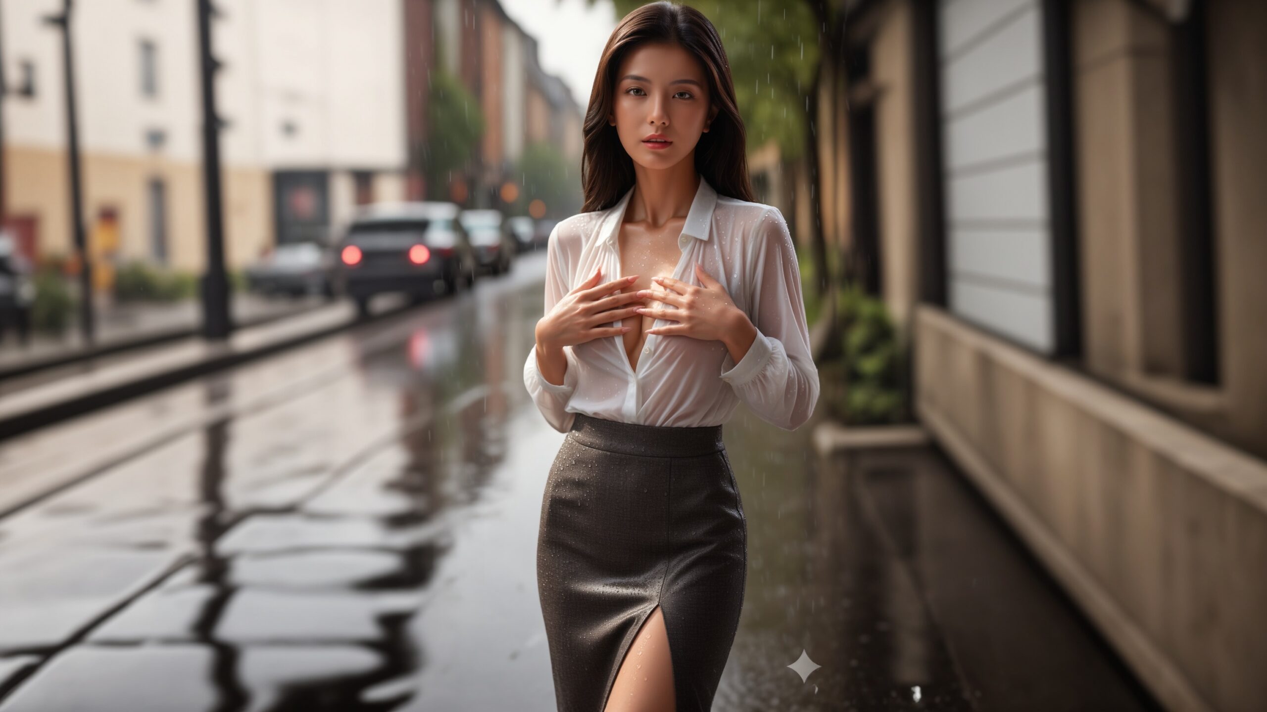 ノーブラでいることを、誰よりも私自身が知っているから。冷たい雨粒が、まるで無数の指先のように薄いシルク越しに私の胸をなぞり、その先端を硬く尖らせていく。この背徳的な感覚に、身体の芯が微かに疼き始める。