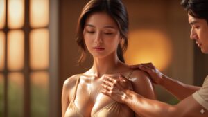 硬く尖ったままの乳首の先端を、人差し指の腹で、くるり、くるりと優しく転がす。最初はくすぐったいような、もどかしいような感覚だったのが、先生の吐息が重なるにつれて、じわじわと快感に変わっていく。